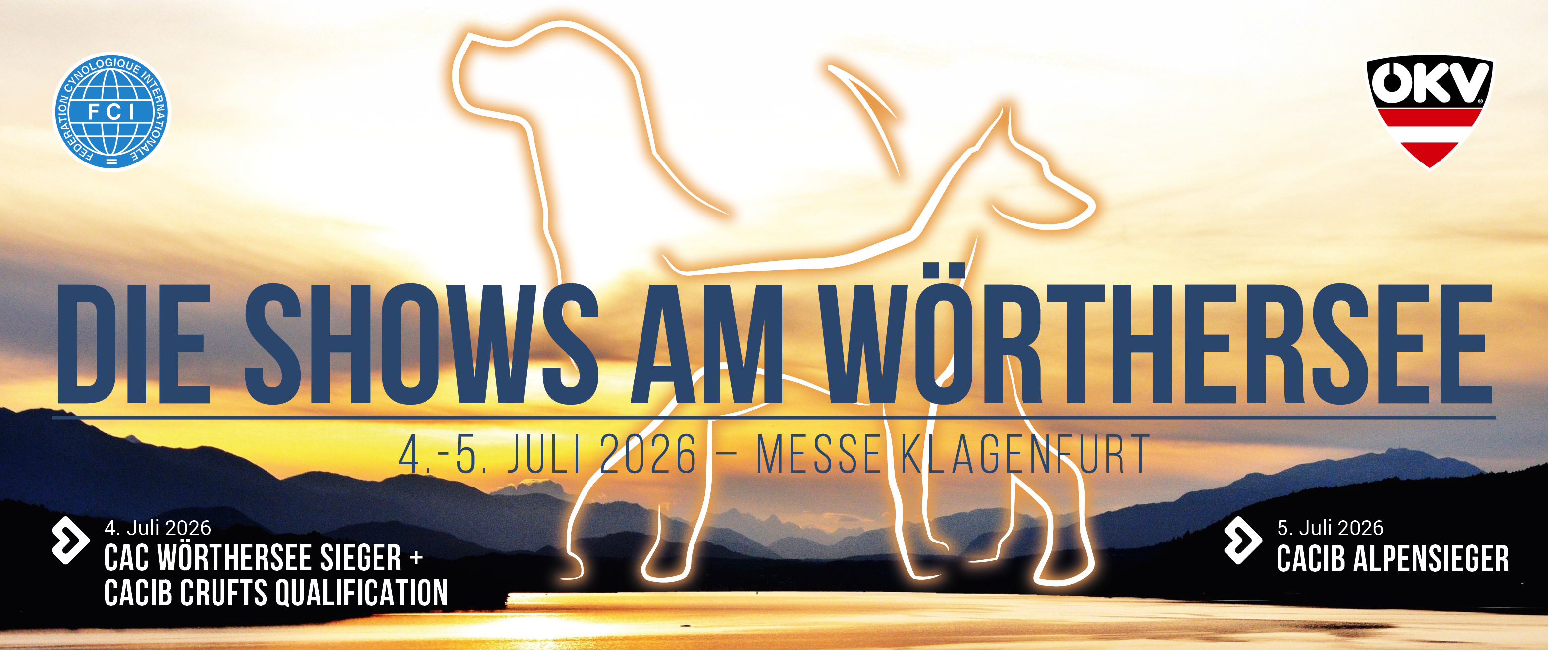 | 04.07.2026 - 05.07.2026 | International Shows Klagenfurt 2xCACIB, 1xCAC Klagenfurt 04.07.2026 - NHA Wörtherseesieger 04.07.2026 - CACIB Crufts Qualification 05.07.2026 - CACIB Alpensieger Alle Rassen an beiden Tagen! Veranstalter: Österreichischer Kynologenverband email: office@oekv.at Homepage: www.oekv.at | |
